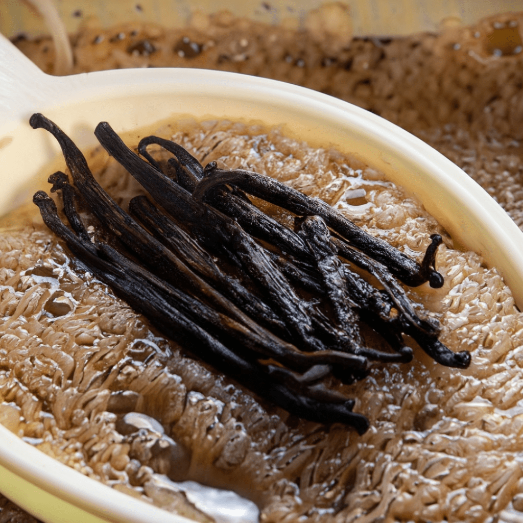 - Vanilleschoten in Desserts: Füge eine aufgeschnittene Vanilleschote zu Milch, Sahne oder Zucker hinzu, um Desserts wie Pudding, Cremes oder Kuchen eine intensive Vanillenote zu verleihen.